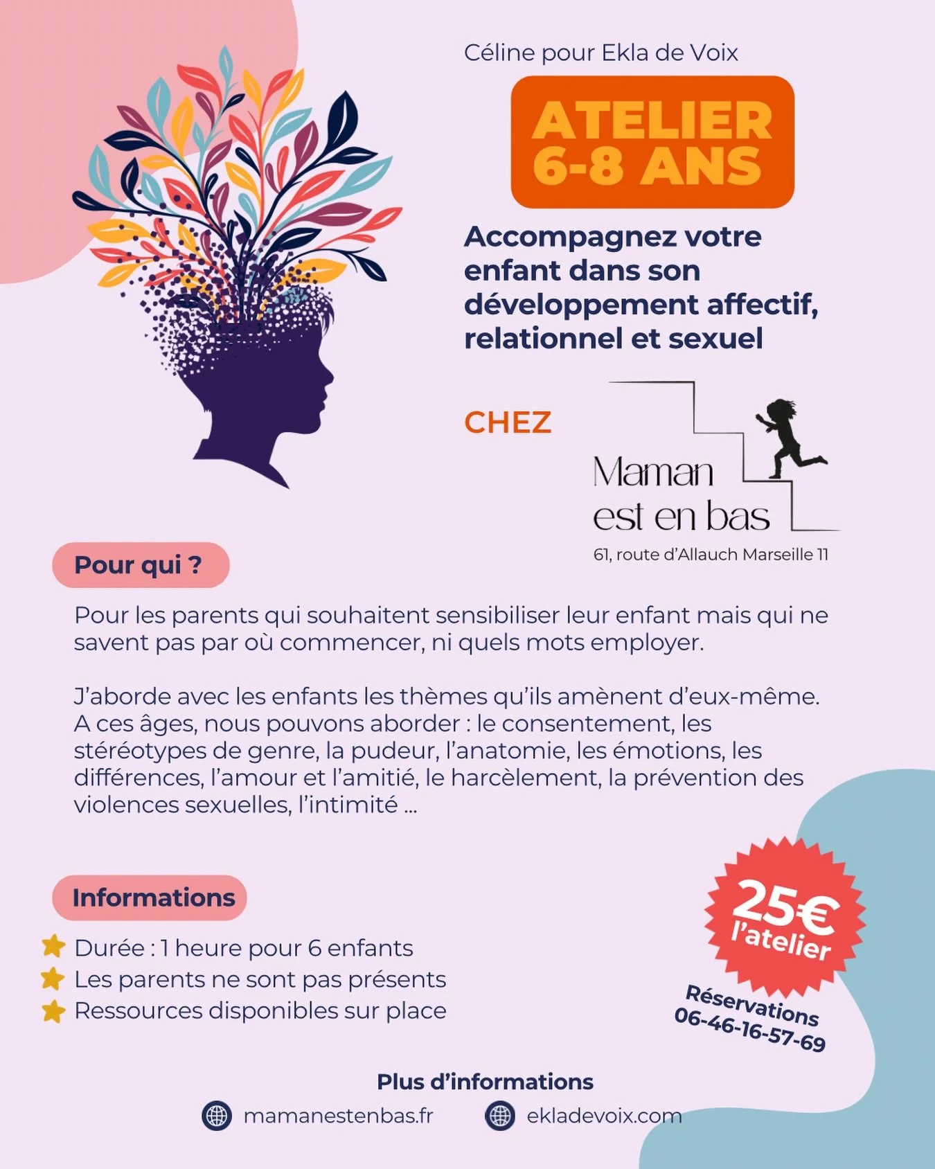 Je suis consultante certifiée en santé sexuelle infantile et en prévention des violences sexuelles sur les enfants de 0 à 12 ans, et animatrice certifiée d’ateliers d’éducation à la sexualité pour les enfants de 3 à 12 ans.